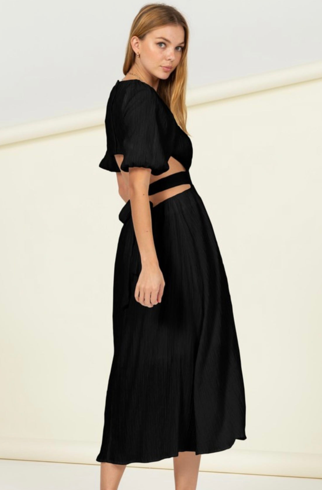Vestido Midi color negro sólido. De cuello redondo. De mangas bombé. Estilo cut out. Forro corto en la falda. Delicados botones en la parte de la espalda.