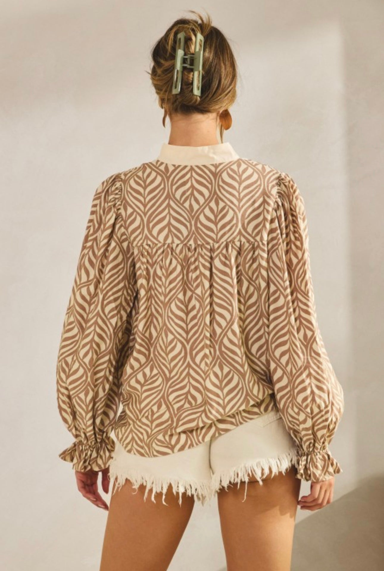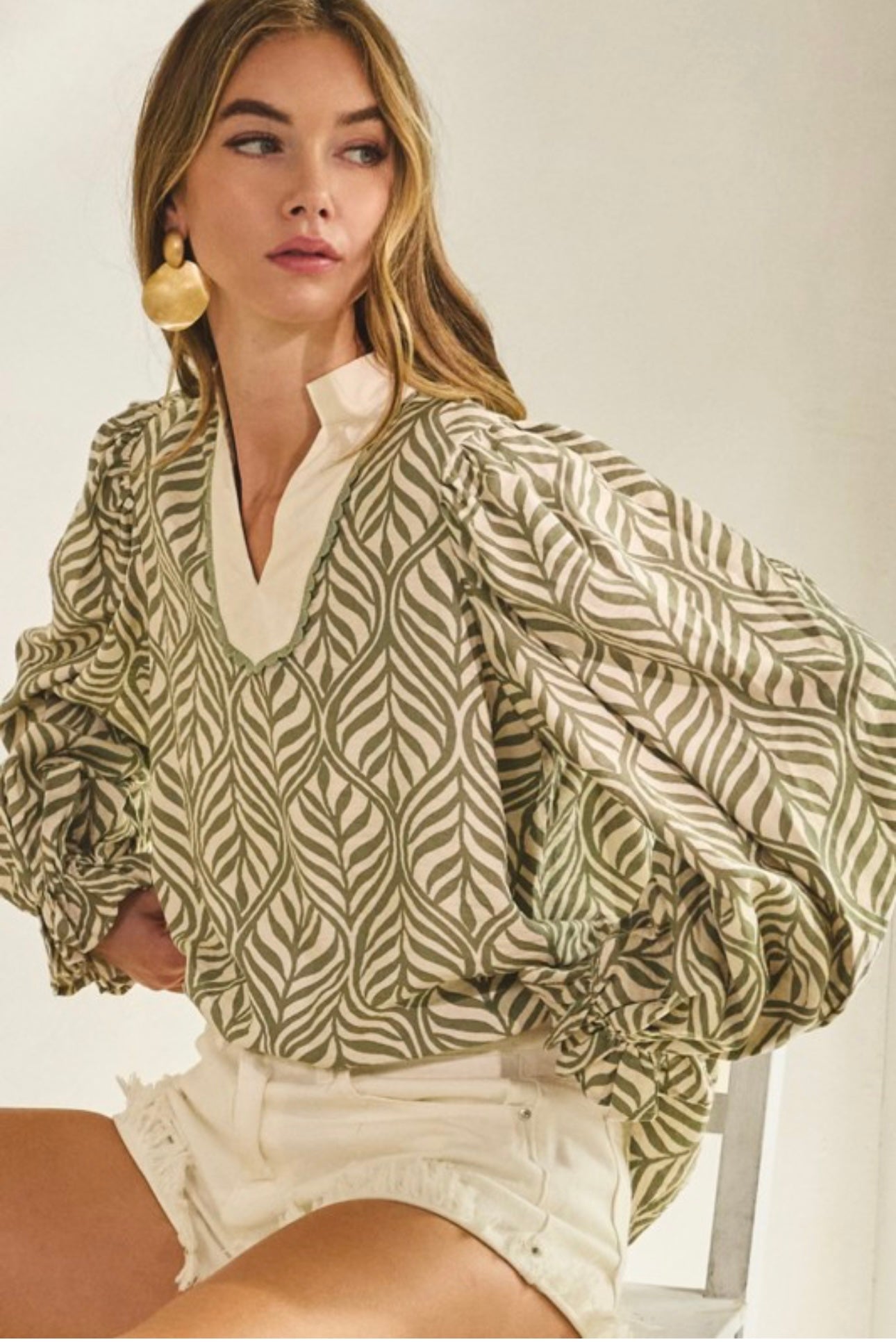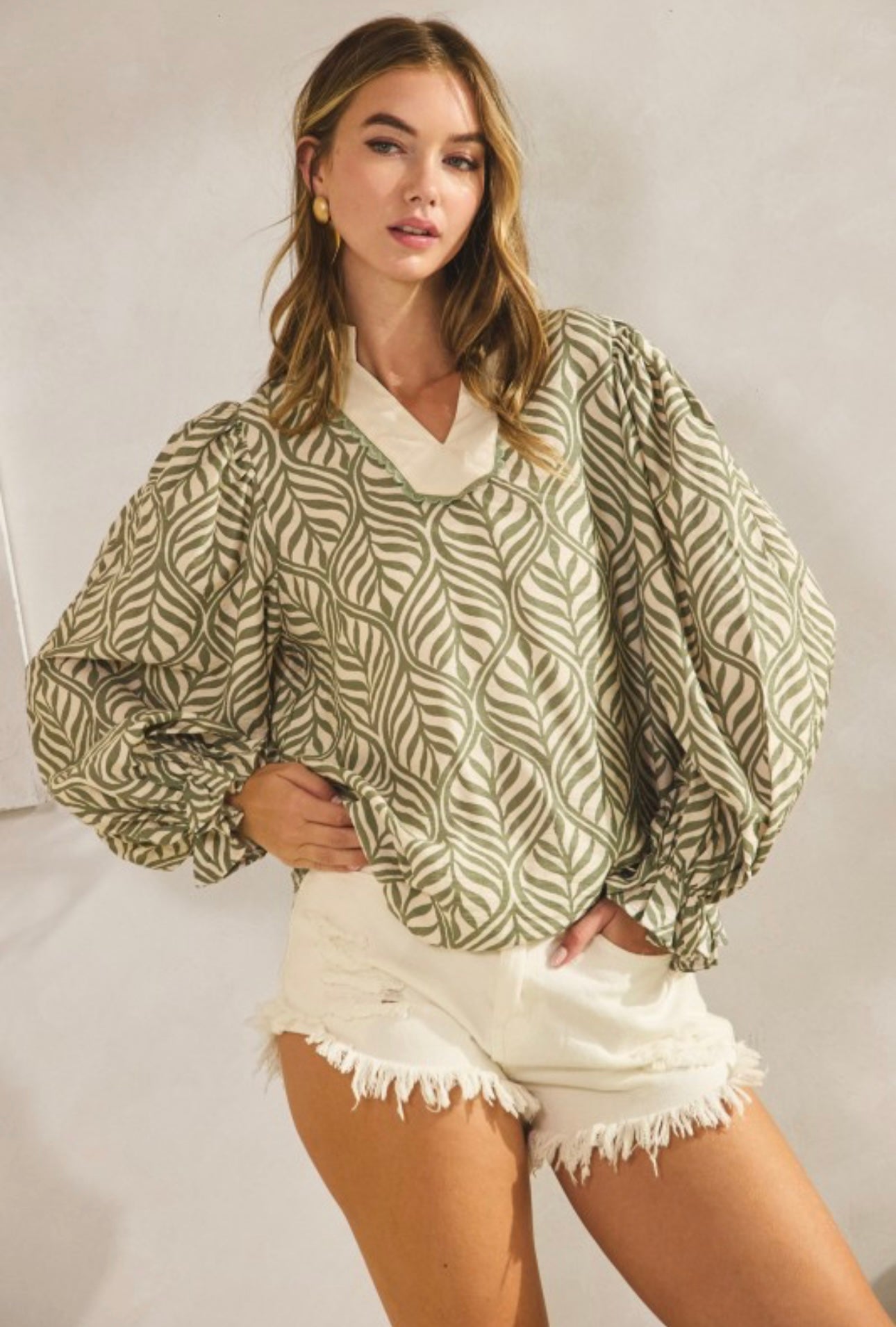 Hermosa blusa abullonada con encaje de hojas de bosque y estampado botánico. Ideal para looks casual chic. Utilízala con cortos, mahones, faldas entre otros. Crea tu propio estilo. Tallas corren sueltas. Modelo lleva puesto talla Small.